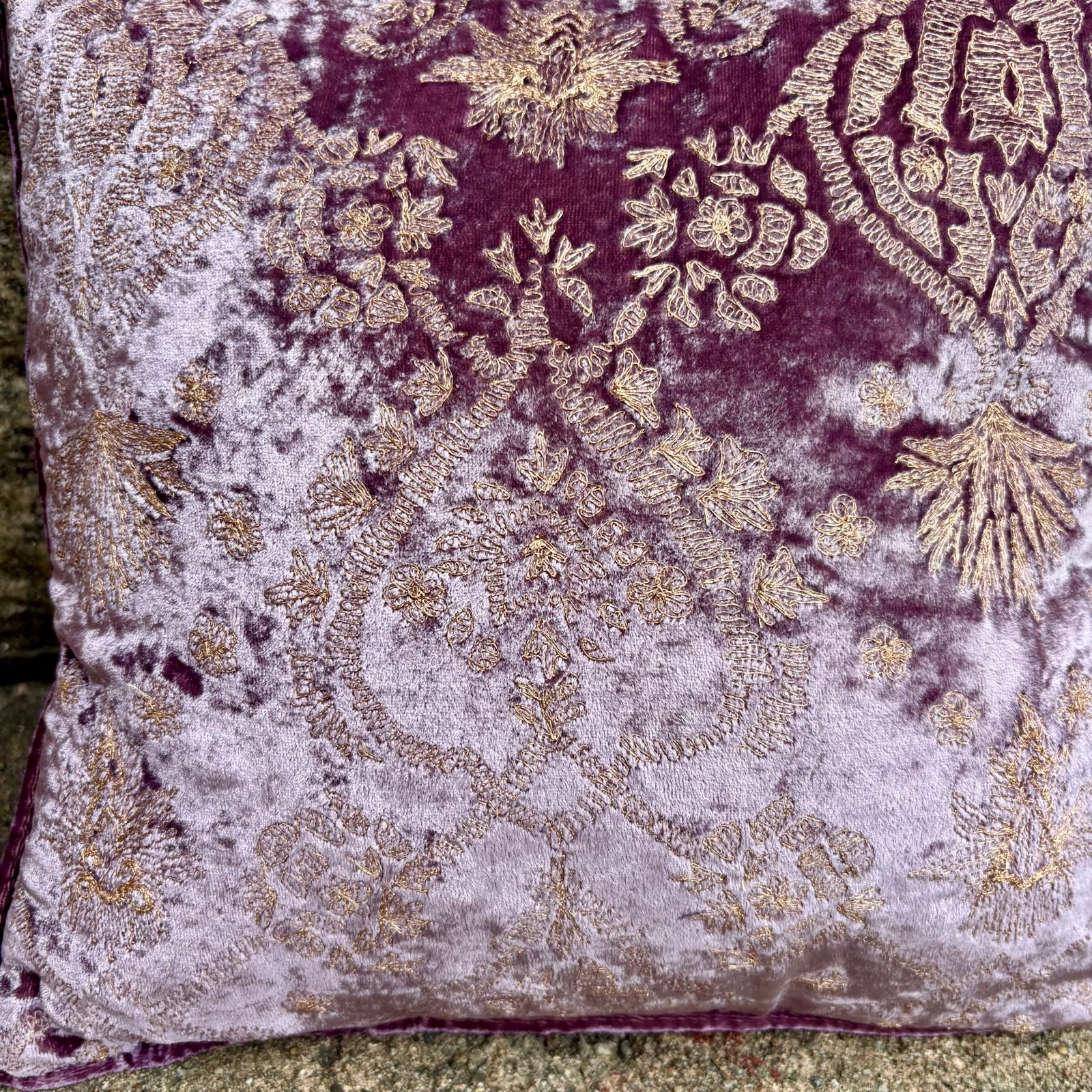Handsydd vacker kudde i finaste silkessammet toppat med ett ljuvligt broderi i metalltråd som ger kudden den lilla extra lyxen. Detta vackra broderi mönster täcks över hela framsidan.