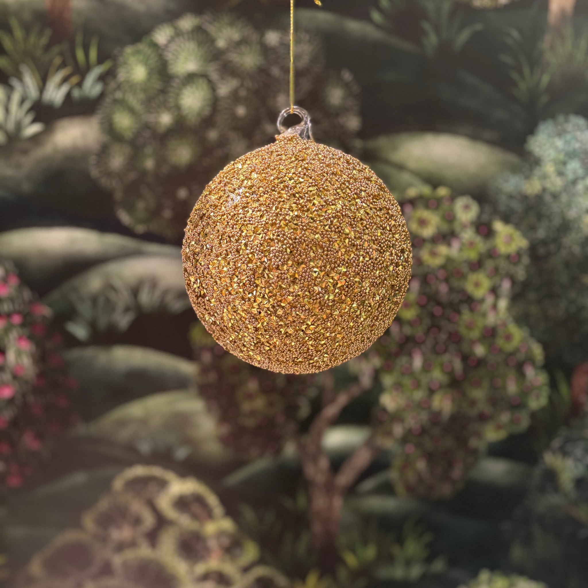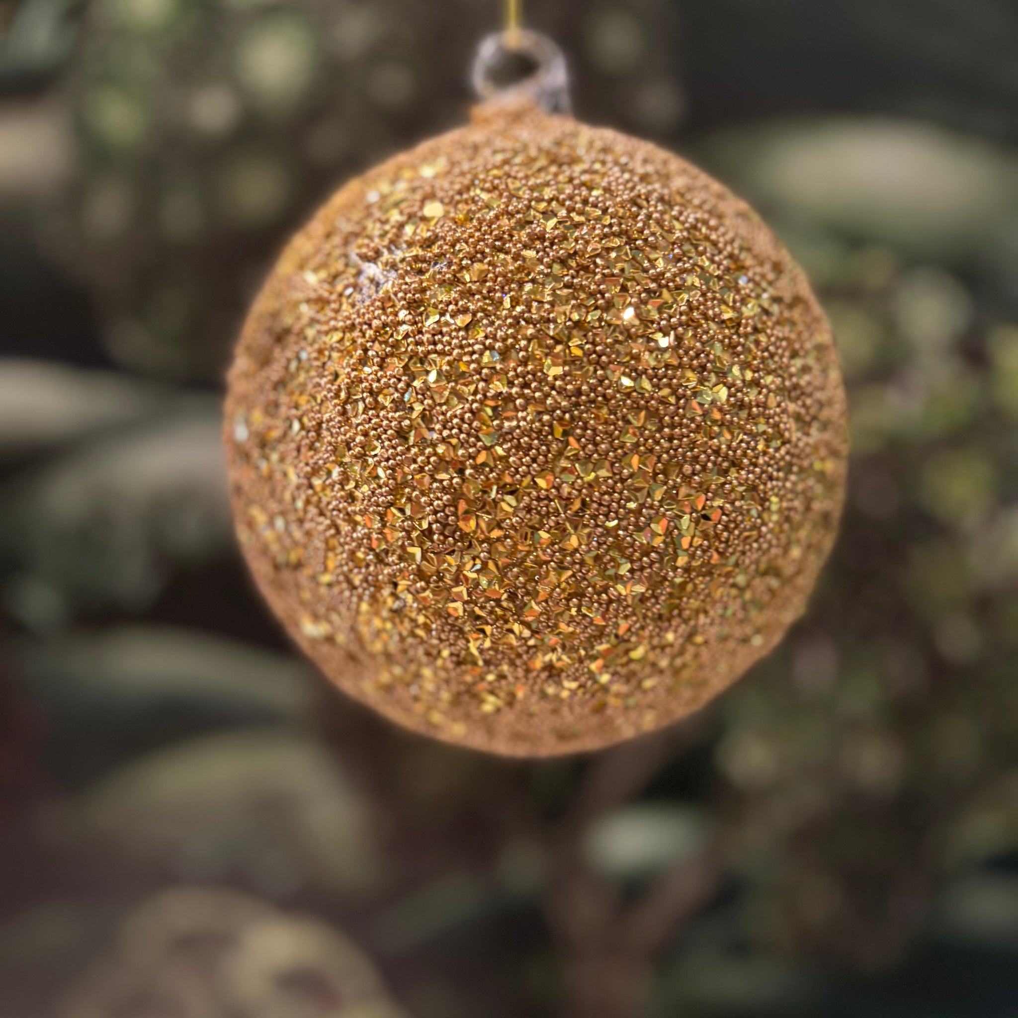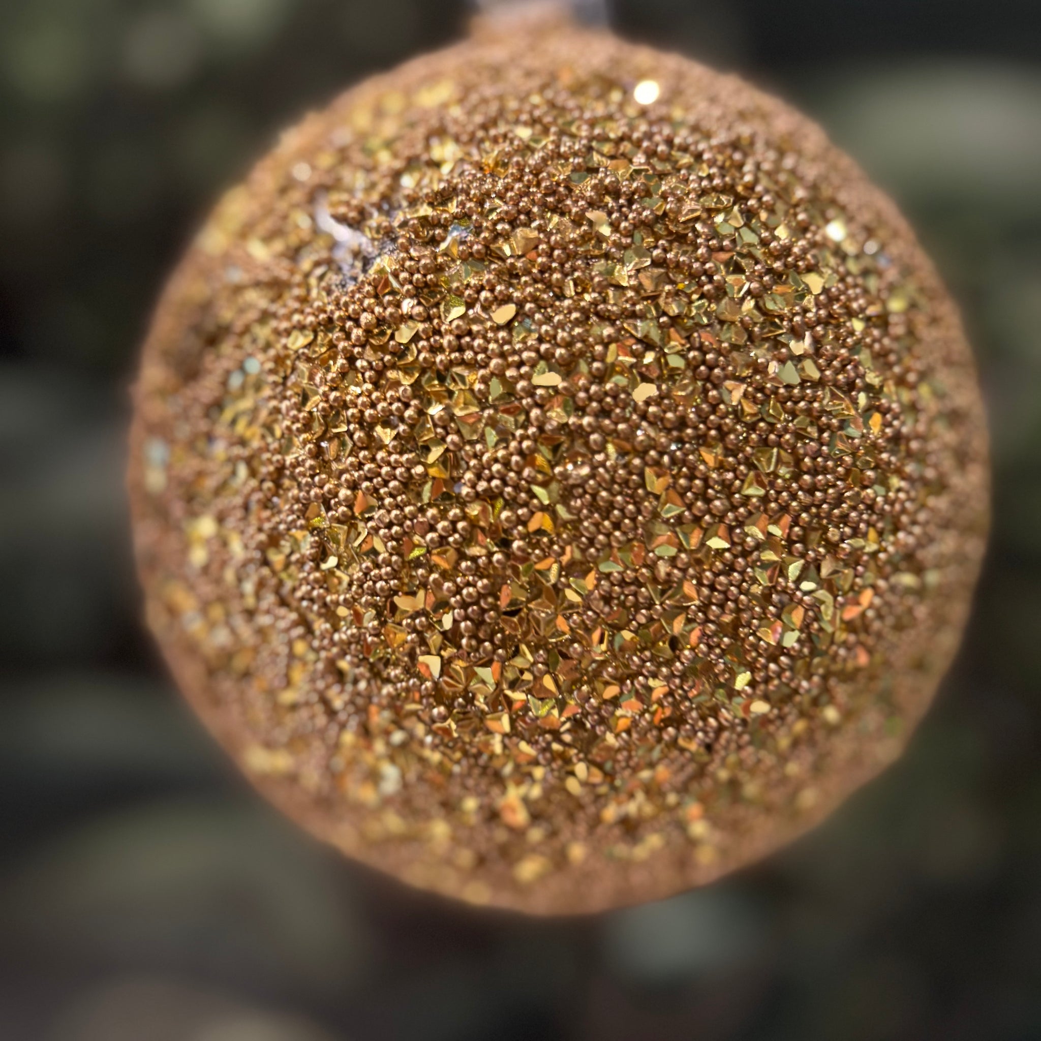 Oemotståndlig dekoration glaskula helt täckt i pyttesmå guldpärlor.