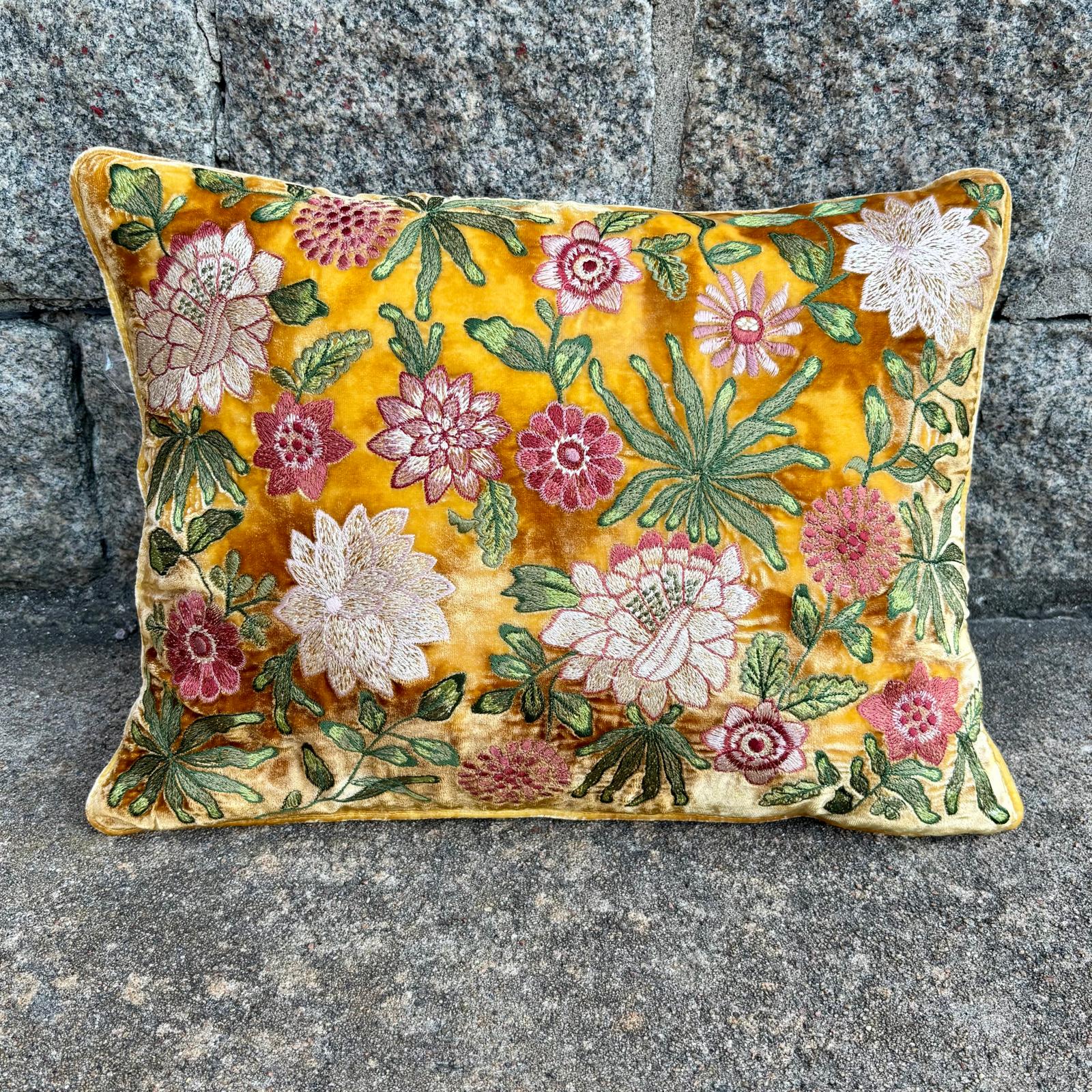 Kudden har en helbroderad framsida sydd i olika färger fyllt av blomster,