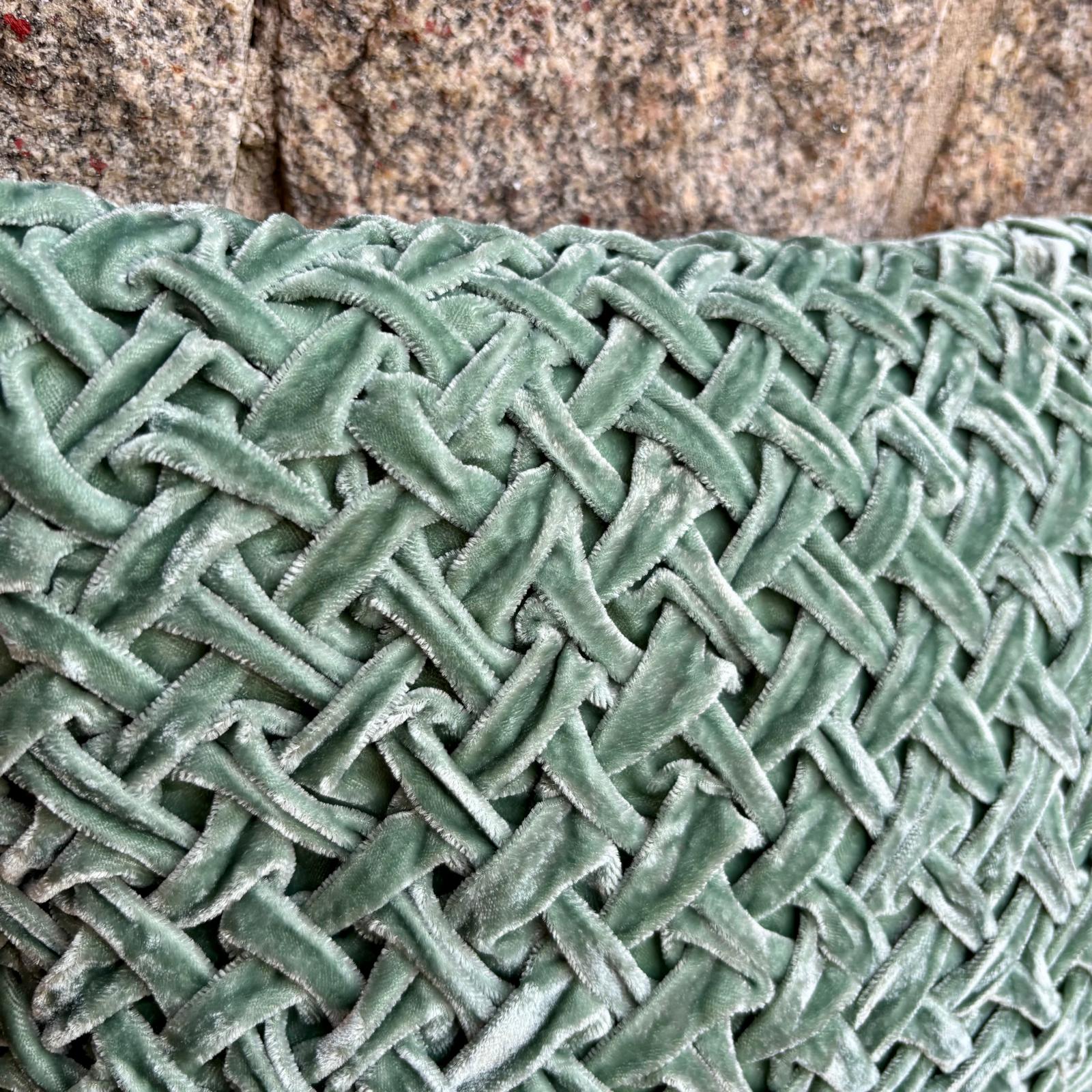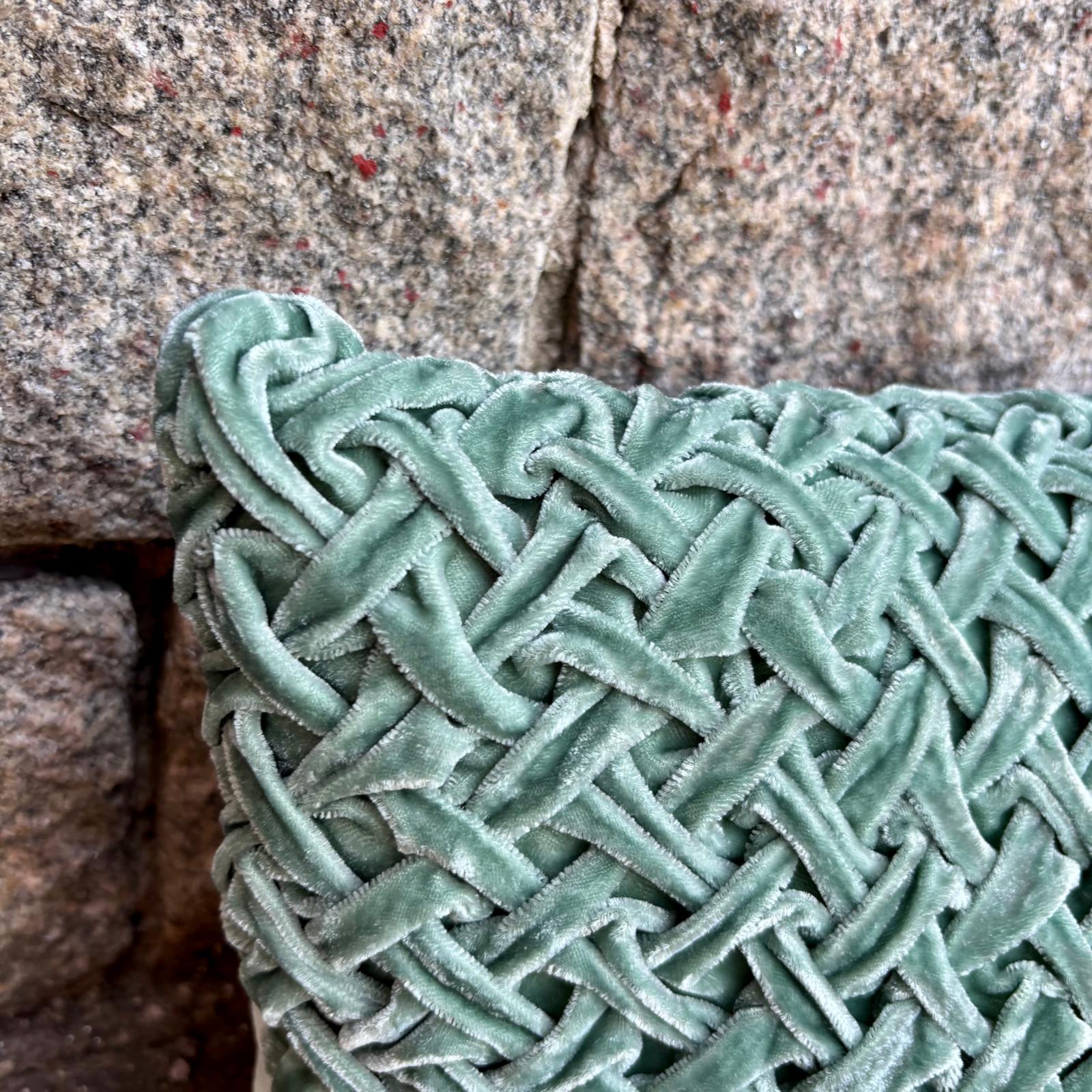 Handsydd vacker kudde i finaste silkessammet och nu som nyhet med denna speciella sydda flätning som var på modet för mycket länge sedan. Påminner om svunnen tid, ett riktigt hantverk. Denna modell förhöjer lätt upp bland dina andra kuddar då det är vackert och dekorativt att blanda material, mönster, struktur och form.
