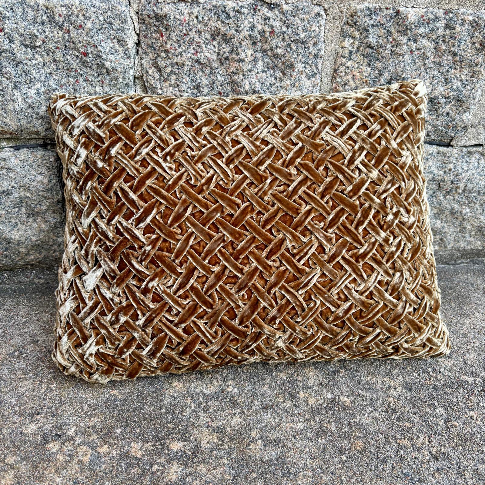 Handsydd vacker kudde i finaste silkessammet och nu som nyhet med denna speciella sydda flätning som var på modet för mycket länge sedan. Påminner om svunnen tid, ett riktigt hantverk. Denna modell förhöjer lätt upp bland dina andra kuddar då det är vackert och dekorativt att blanda material, mönster, struktur och form.