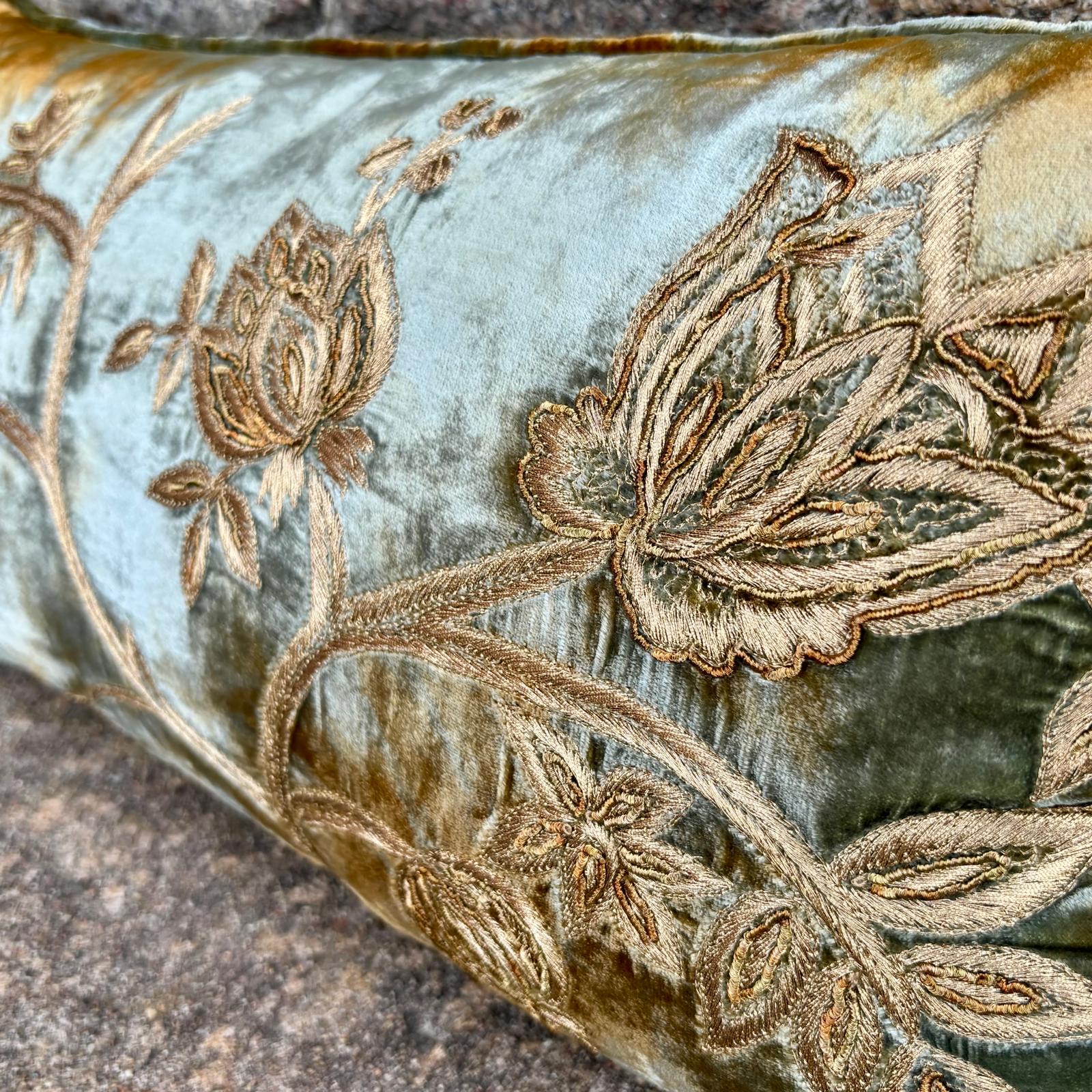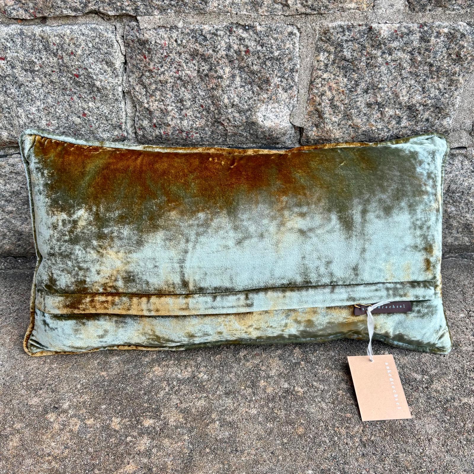 Unik designad kudde i en otroligt vacker havsgrön blå med bruna inslag i sin silkessammet.