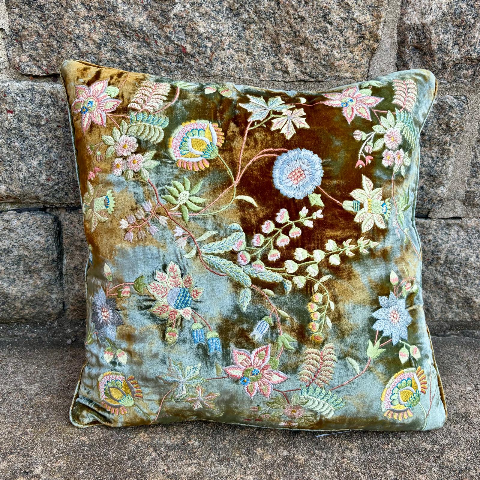 Kudden har en helbroderad framsida sydd i olika färger fyllt av blomster,