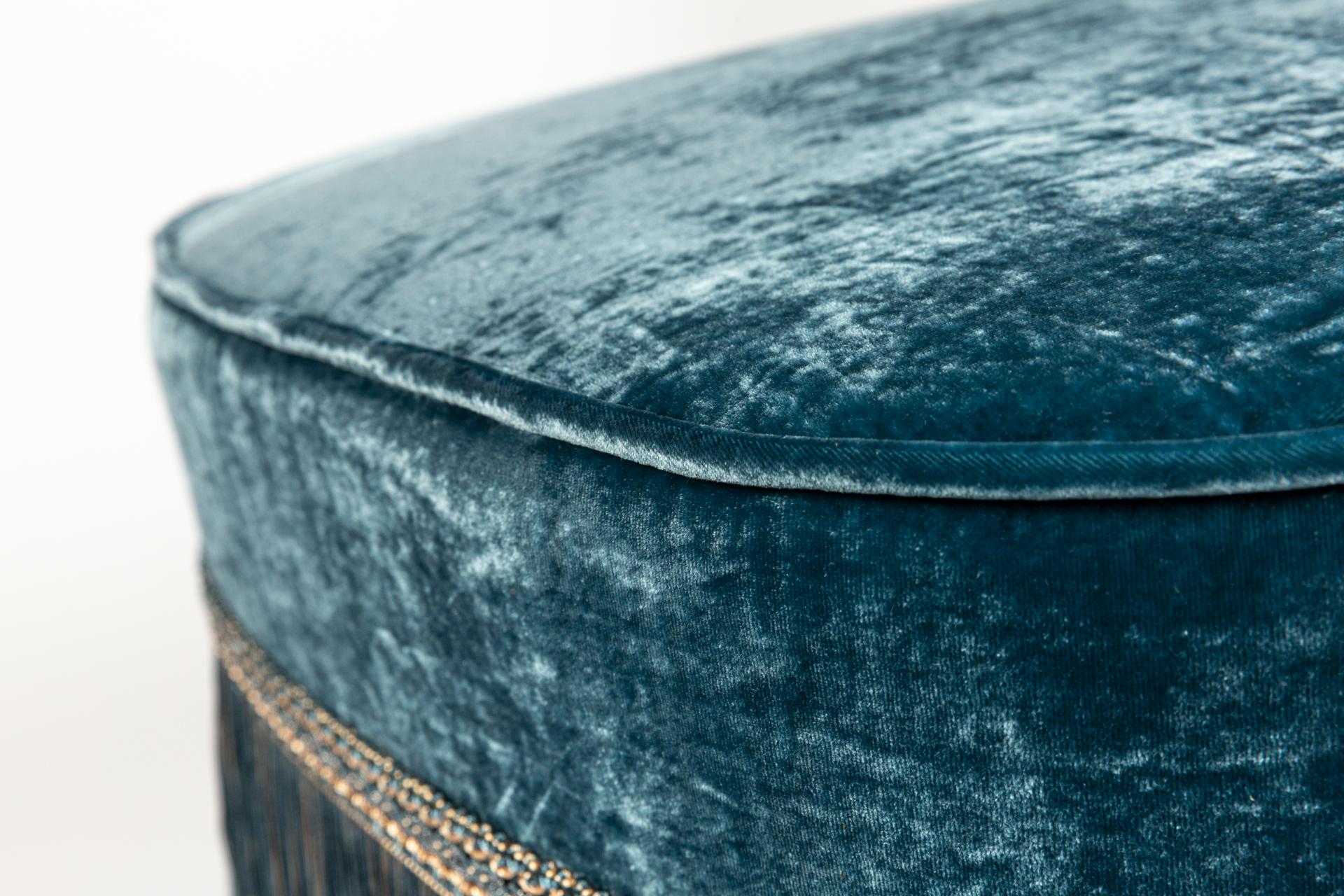 Vacker fåtölj i en ljuvlig blå nyans i silkessammet och dubbel lång frans nertill.