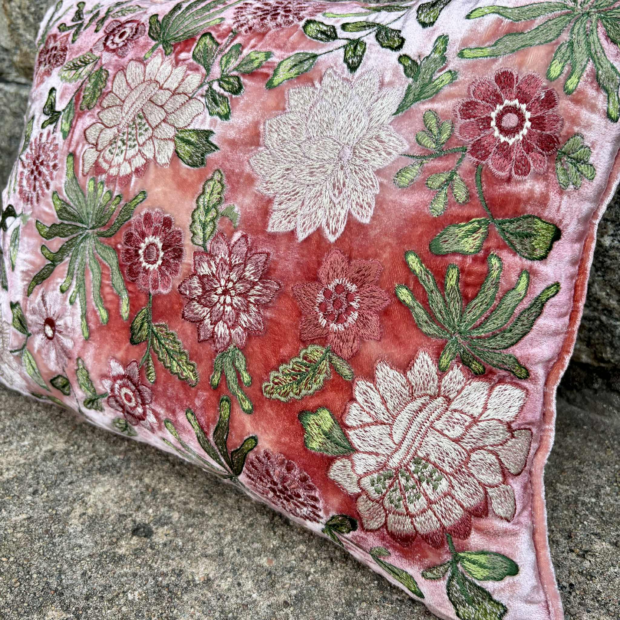 Kudden har en helbroderad framsida sydd i olika färger fyllt av blomster,