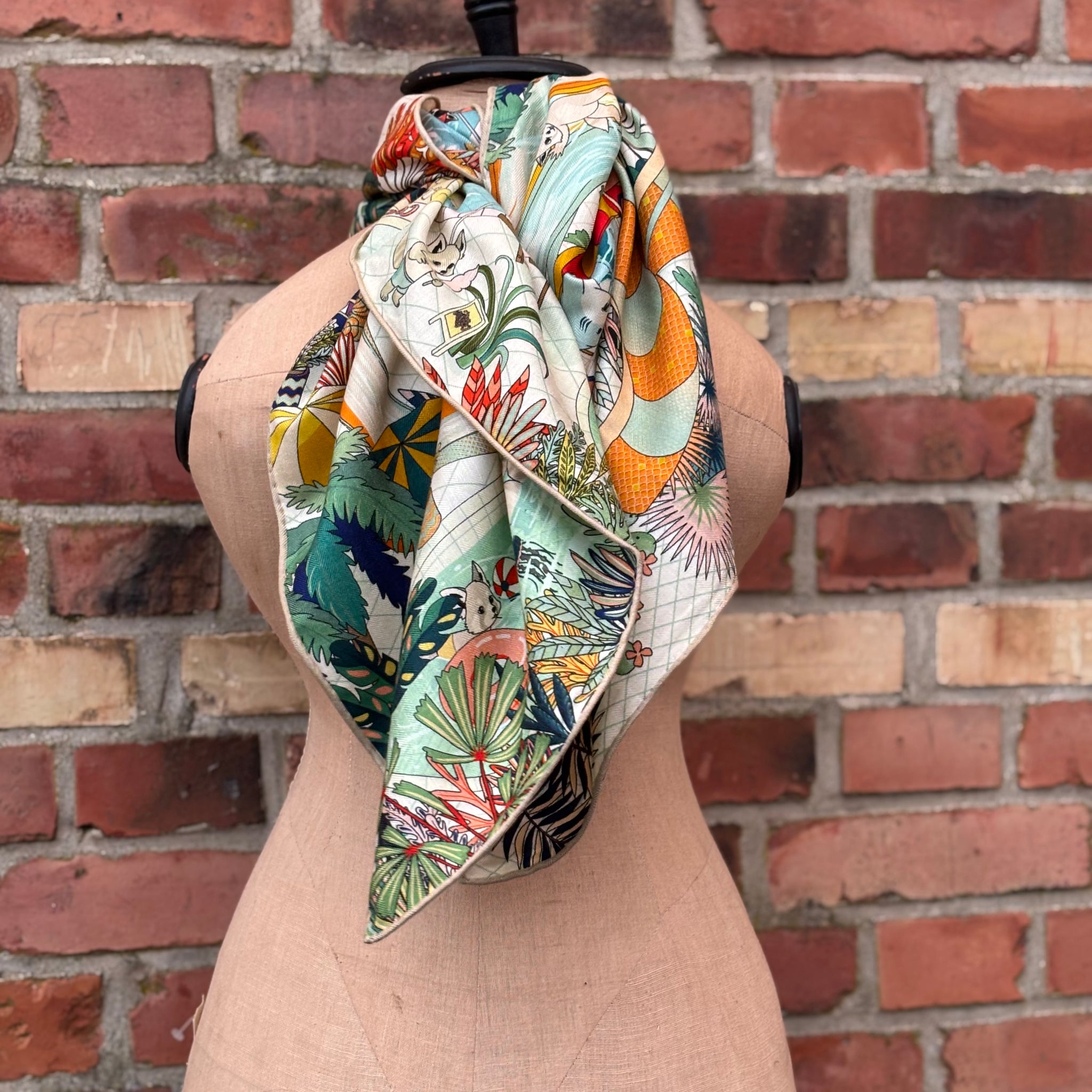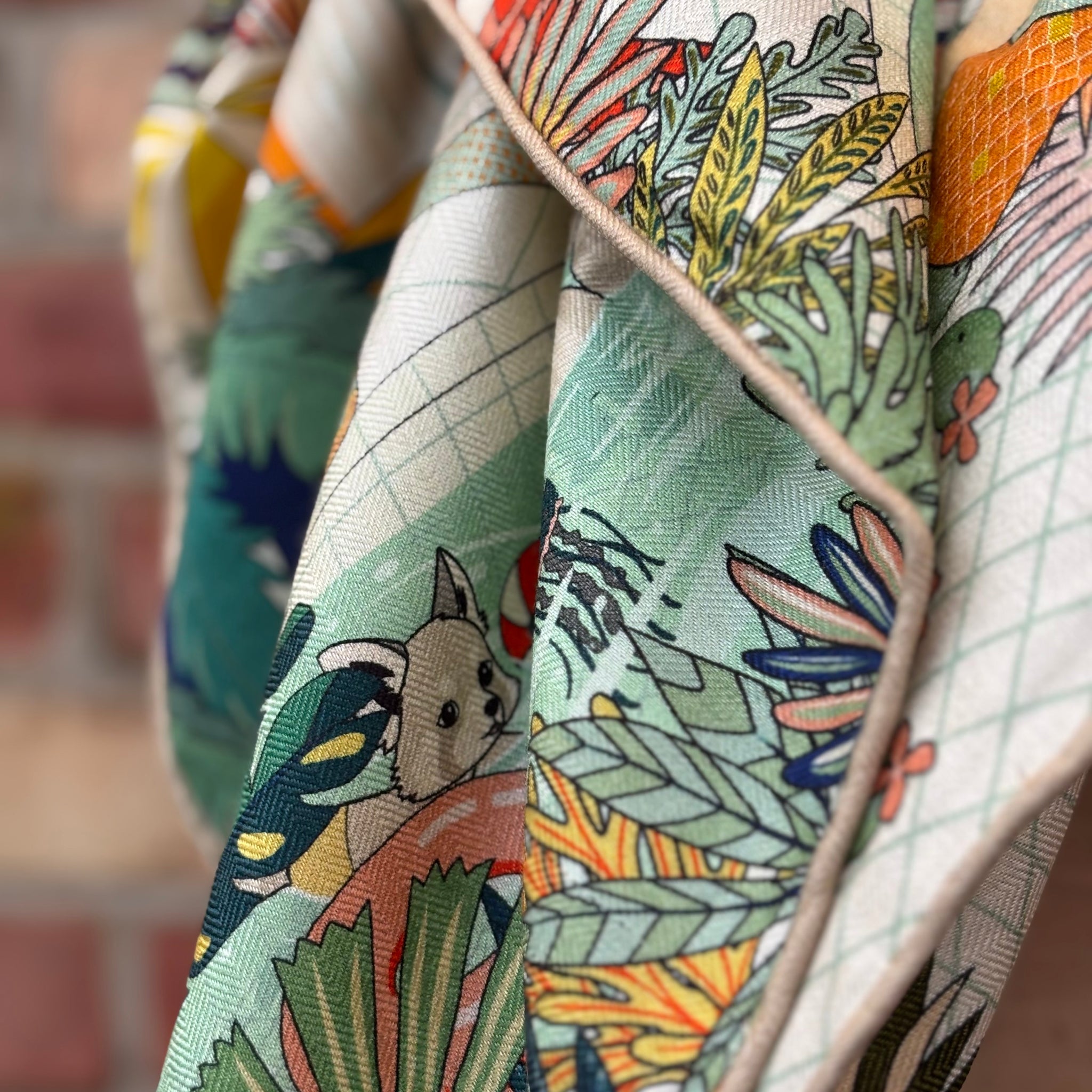 Stor ull- och sidensjal, handrullad och med dubbelt digitaltryck. Perfekt för att förbättra vilken formell outfit som helst.