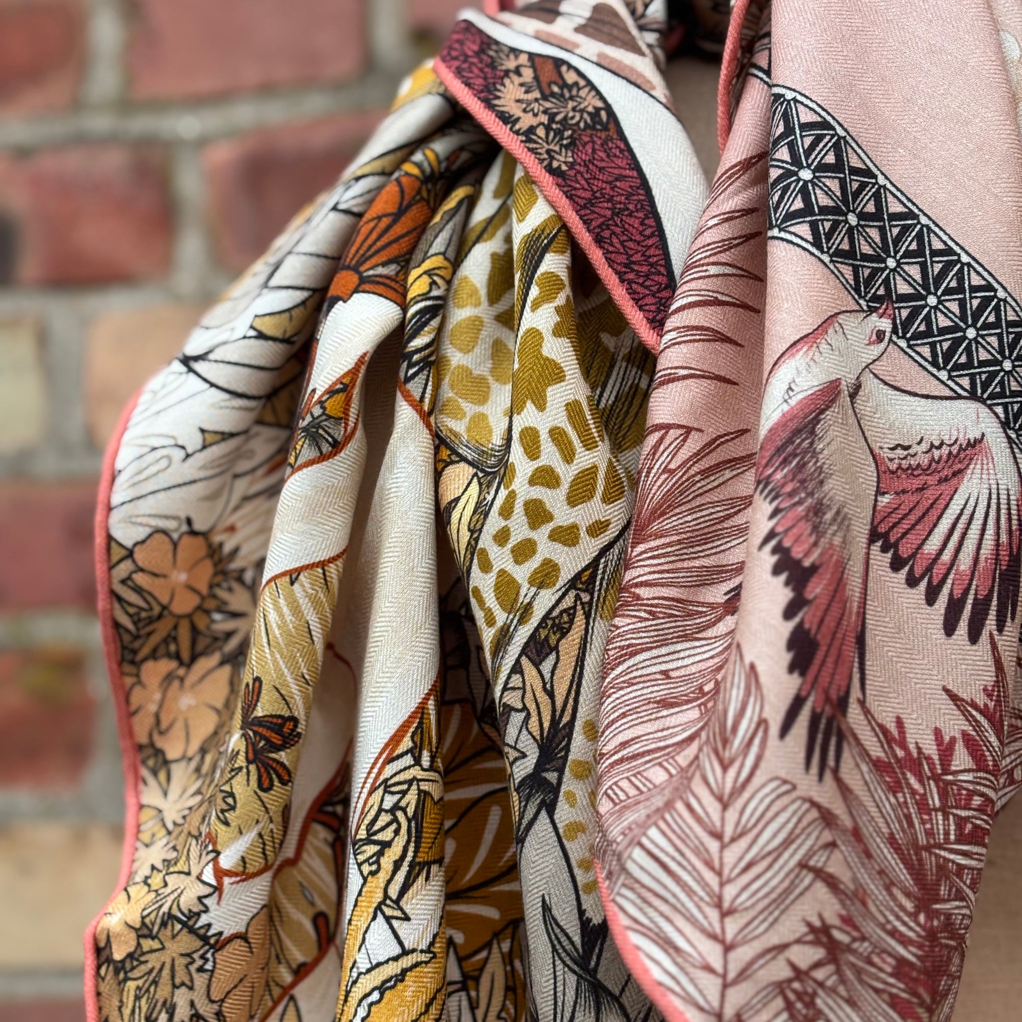 Stor ull- och sidensjal, handrullad och med dubbelt digitaltryck. Perfekt för att förbättra vilken formell outfit som helst.